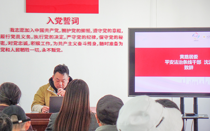 随后,活动以宪法宣传短片拉开序幕。短片回顾我国法治建设历程,凸显宪法作为国家根本大法的崇高地位。黄路居委平安法治条线干部沈波致辞。他代表居委对师生们的到来表示欢迎,并指出:“社区是社会治理的基础单元,法治是社区和谐稳定的基石。《中华人民共和国民法典》作为‘社会生活的百科全书’,与每一位居民的日常生活密切相关。希望通过今天的活动,进一步提升大家的法治意识,携手构建知法、守法、用法的新型和谐社区。”
